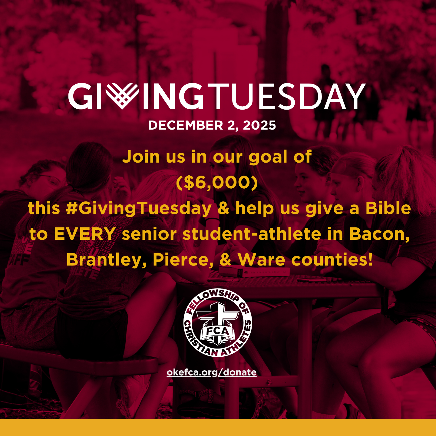 Okefenokee FCA (Fellowship of Christian Athletes) has launched a campaign to utilize #GivingTuesday to raise funds to provide a personalized FCA Bible to every senior athlete in Bacon, Brantley, Pierce, & Ware counties. The cost to reach this goal is approximately $6,000. Please consider supporting our efforts to put the Word of God in the hands of our senior athletes.